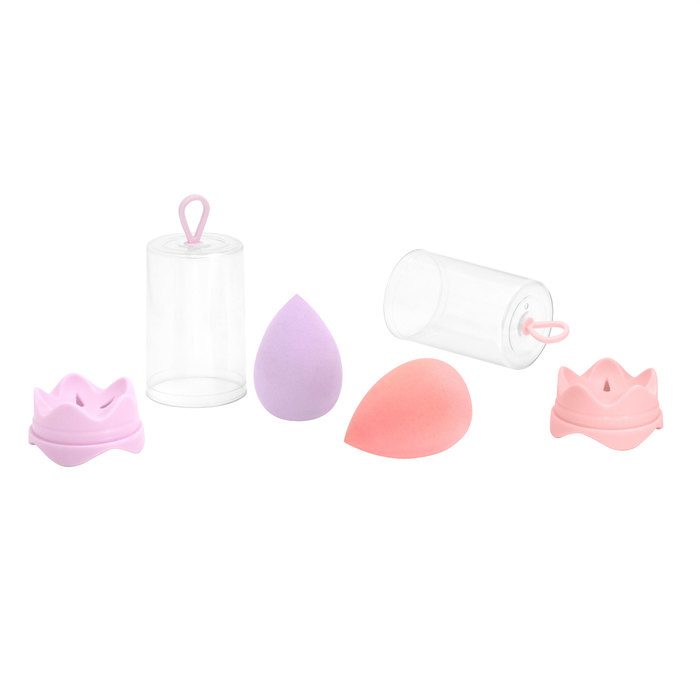 - Esponja de maquillaje. Estuche de plástico transparente (4,5 x 8,5 cm.) con gancho y base del mismo color que la esponja