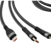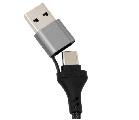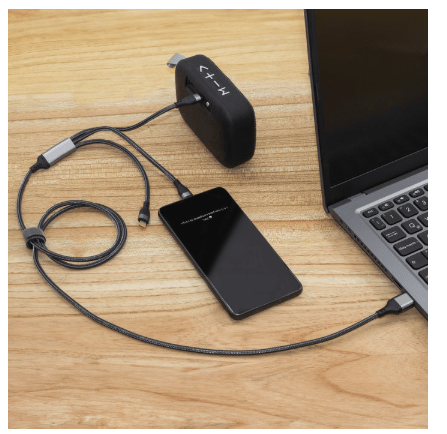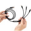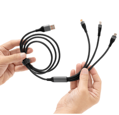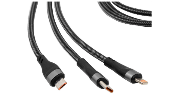 Carga al instante, vive sin límites.Cable de carga rápida. Entrada 2 en 1: USB y USB-C. Salida: USB-C, microUSB y lightning. Max 20V 3A. Color gun con toques naranjas en cada conector. Precinto de velcro fijada al cable. Medidas: 120 cm. (extendido).