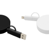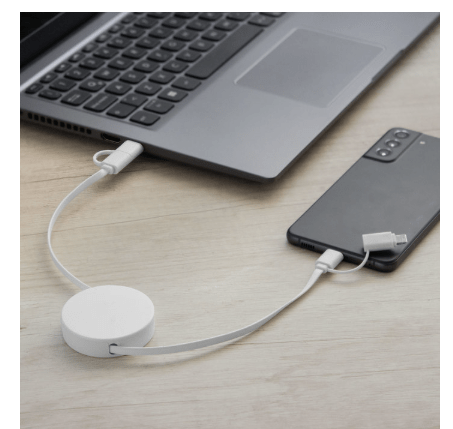 Llévalo a donde vayas.Cable de carga retráctil con longitud de hasta 90 cm. Carga y transferencia de datos de alta velocidad. Carga rápida de 65W. Entrada 2 en 1: USB y USB-C. Salida: 2 en 1: Lightning y USB-C. Diseño con acabado mateMedidas: Ø 5,3 x 1,3 cm.