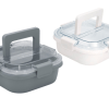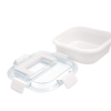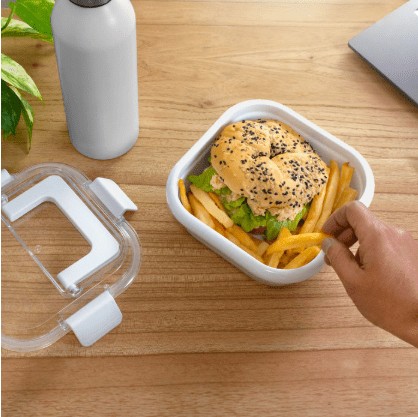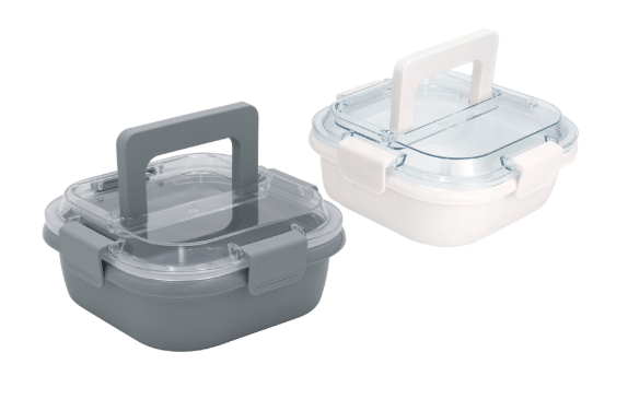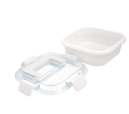 17,8 x 17,8 x 7,6 cm. Capacidad 1 litro. Plástico Polipropileno. Contenedor de alimentos. Tapa translúcida con cuatro clips de cierre hermético y asa para trasladar cómodamente. Clips y asa del mismo color que el recipiente.