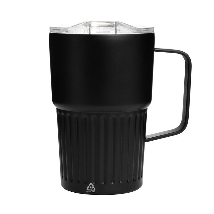 Diseño texturado para mejor agarre.Mug doble pared con asa, sellado al vacío. Mug con aislamiento térmico. Tecnología vacuum. Interior en acero 304 reciclado y exterior en acero 201. Tapa de poliestireno con anillo de silicona. Asa metálica. Pintura acabado semi mate. Parte inferior texturada. Mantiene hasta 12 hs la temperatura de las bebidas calientes y 24 hs de las bebidas frías.Medidas: Ø 8,7 cm x 14 cm. (no incluye asa)