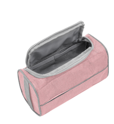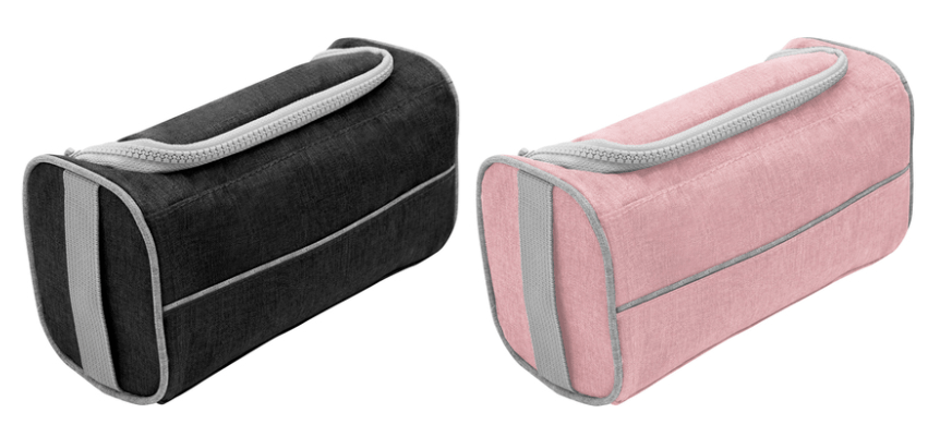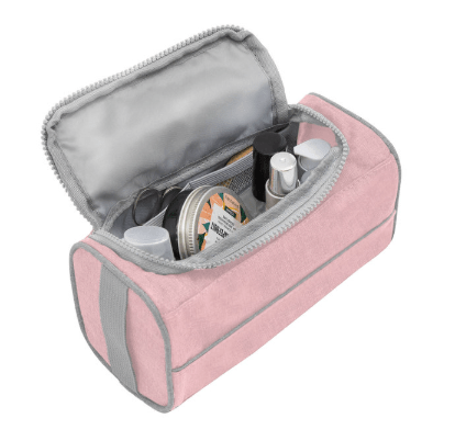22 x 10 x 12 cm. Poliéster 300D bicolor. Necessaire con tapa. Organizador con dos bolsillos internos de red elastizados, tapa acolchada con cierre plástico color gris y asa lateral de tela color gris para transportar.