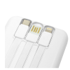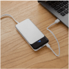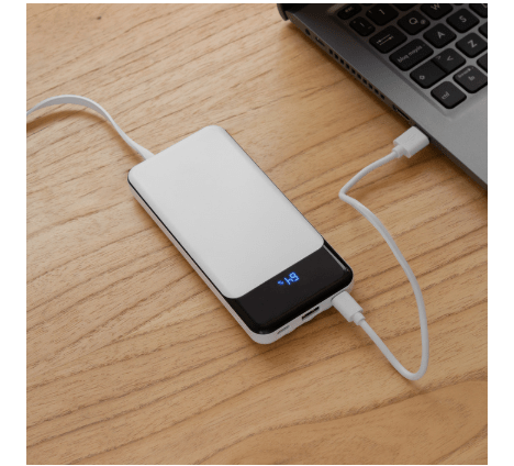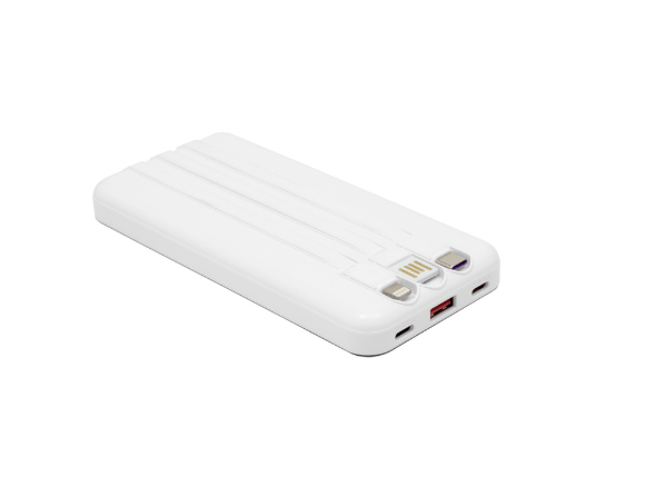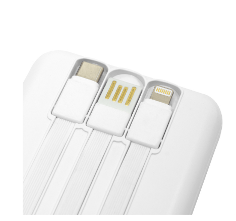 Energía en tu bolsillo.Power bank multipuerto. Pantalla LCD. 2 entradas USB tipo C. 1 salida USB. Entrada y Salida de carga rápida 5V 2A. 3 cables de carga integrados: USB standard, USB Tipo C y lightning.Medidas: 14,5 x 6,8 x 1,8 cm.