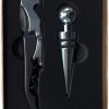 13 x 10 x 2,5 cm. Metal. Accesorios para vinos. Sacacorcho y tapón de metal. Estuche de cartón. Presentación en caja de regalo.