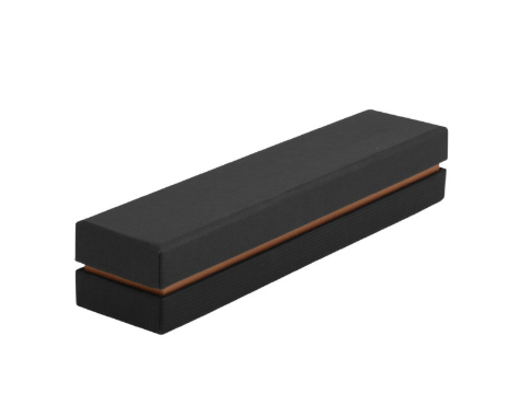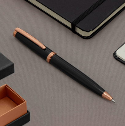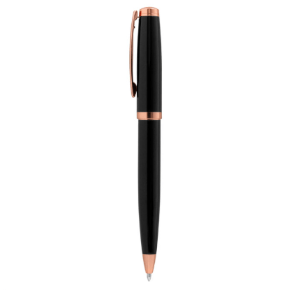 Metálico. Cuerpo color negro laqueado. Puntera, clip y anillo metálico en rose gold. Apertura giratoria. En la parte superior destape electroplateado rose gold. Tinta azul. Presentación en caja de regalo color negra, con detalle rose gold metalizado en su interior.