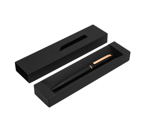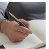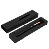Diseño elegante para quienes valoran calidad y sostenibilidad.Bolígrafo con apertura giratoria. Cuerpo metálico en negro mate. Cuerpo de aluminio reciclado. Destape electroplateado en cobre en la parte superior. Recarga metálica. Clip y anillos metálicos color gold rose.