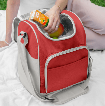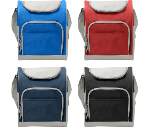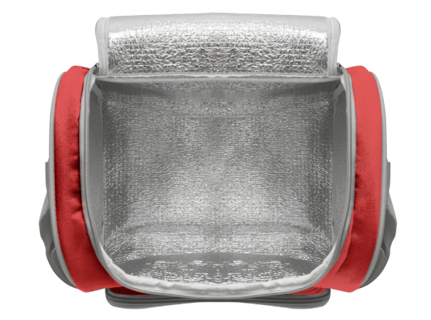 34 x 25 x 19 cm. Capacidad 16l. Polyester 600D. Bolso térmico. Interior totalmente recubierto de aluminio. Bolsillo frontal, correa extensible y cierres metálicos con tira cierres de cordón.