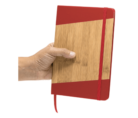 21 x 14 cm. (A5). PU + Papel. Libreta. Tapa dura recubierta en PU, con estampado simil bambú. Interior 80 hojas rayadas en papel de 70 g. Cinta señaladora y cierre con banda elástica del mismo color.