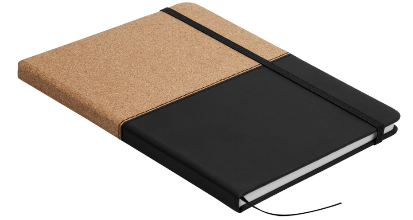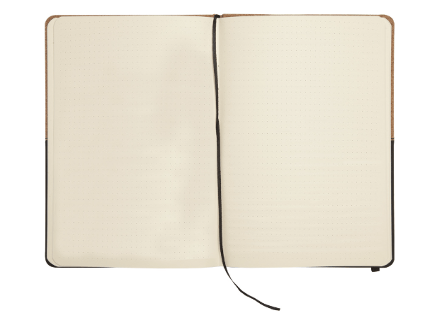 21 x 14,2 x 1,3 cm (cerrado) 21 x 28 x 1,3 cm. (abierta) Libreta de símil corcho y PU con detalle de costura. 80 hojas con renglones punteados, señalador de tela y elástico de color que cierra o sostiene la hoja.