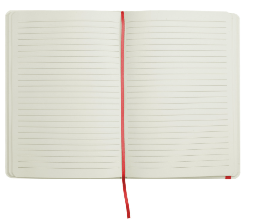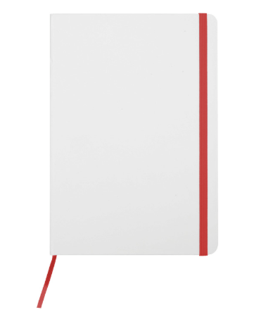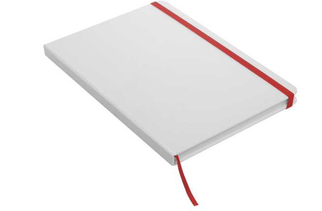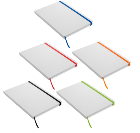21 x 14,5 x 1 cm. Cartón. Libreta de tapa dura color blanco. Contiene 80 hojas rayadas, señalador y cierra con banda elástica del mismo color.