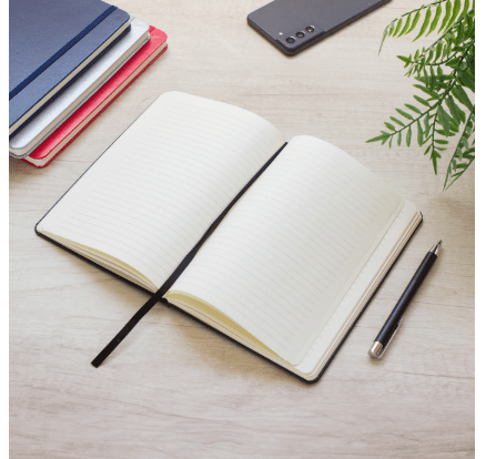 Mantén tus ideas organizadas.Libreta. Tapa de cartón de 300g recubierta en poliuretano de diferentes colores. Interior de 80 hojas rayadas en papel obra crema de 80g. Encuadernación cosido. Incluye cinta señaladora del color de la tapa. Cierre con banda elástica del mismo color.Medidas: 14 x 21 x 1,5 cm.