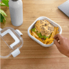 17,8 x 17,8 x 7,6 cm. Capacidad 1 litro. Plástico Polipropileno. Contenedor de alimentos. Tapa translúcida con cuatro clips de cierre hermético y asa para trasladar cómodamente. Clips y asa del mismo color que el recipiente.