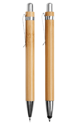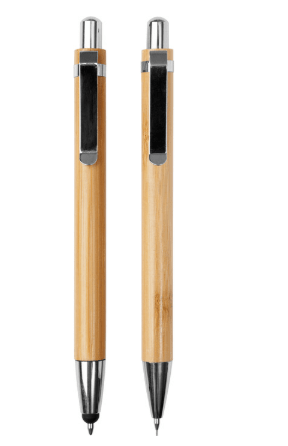 Bambú. Set de bolígrafo y lápiz mecánico. Cuerpo de bambú. Clip metálico. Puntera y pulsador de plástico. Tinta negra. El bolígrafo con puntera touch. En caja de cartón que simula ser madera.