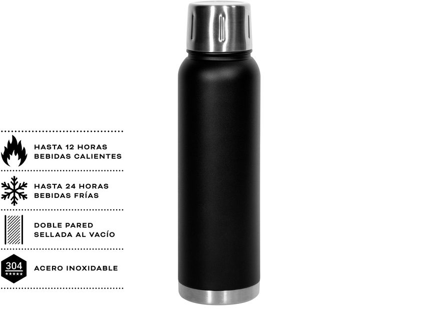 Ø 8,4 x 30 cm. Capacidad 1000 ml. Acero inoxidable. Termo Doble pared con recubrimiento de cobre. Interior en acero 304 y exterior en acero 201. Pintura Powder Coat (pintura mas duradera y resistente a la corrosión y el paso del tiempo). Tapa de acero a rosca. Tapón con apertura y cierre a presión.  Mantiene por más de 12 hs la temperatura de las bebidas calientes y 24 hs de las bebidas frías. Presentación en caja de regalo.