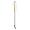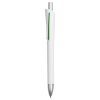 Plástico. Cuerpo blanco mate. Clip, punta y pulsador color plata. Debajo del clip detalle de color. Tinta azul.