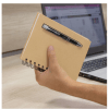 13 x 18 cm. Libreta color Kraft, anillado metálico y 70 hojas punteadas de 70g. Bolígrafo metálico (BP295) color negro con tinta negra. Mediante sistema de imanes el bolígrafo queda sujetado a la tapa, causando un efecto sorprendente.